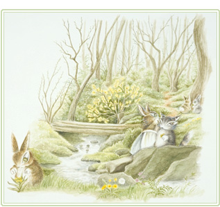 昼間の水辺や小道はとても綺麗。キラキラ光る水や小さな花が咲き乱れて、ダヤンとマーシィ、