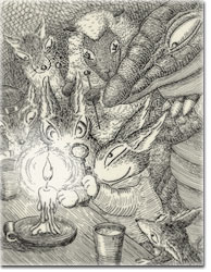 たまげたのはキマイラです。あとさき考えず、蜂に化けているキマイラはあんぐり開いた魔王の口から、弾丸のように跳びこみました。